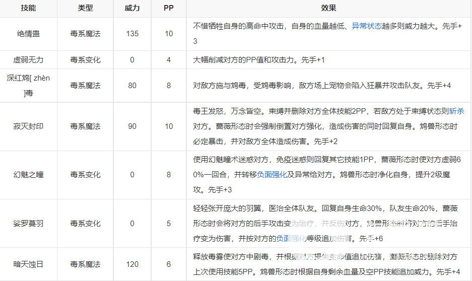 幻鸩毒王一共有七个技能,在战斗开始前,可以选取其中的四个放入技能框中使用,根据需求的不同,可以构建不同的技能组,发挥不同的作用,例如说如果要想让毒王打辅助的话,可以携带娑罗蔓羽和幻魅之瞳,裟罗蔓羽可以减少队伍受到的伤害,裟罗蔓羽可以治疗队友;如果要做输出的话把裟罗蔓羽换成万毒鸩羽就行了,无论作辅助还是输出,毒王都必须携带暗天蚀日和寂灭封印这两个核心技能,没有它们,她的作用会少很多。