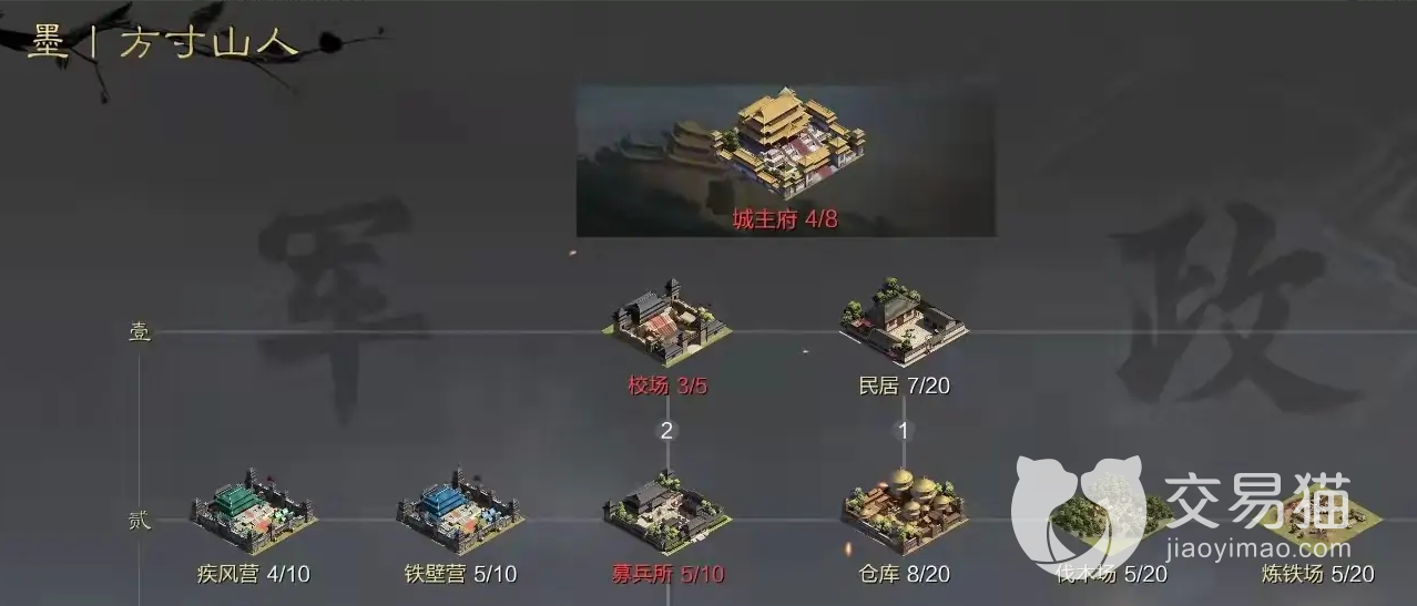 先组建临时队伍,这里只要不放佩戴印信的武将就可以,前期需要使用这个临时开荒,征兵打三级地升级,等到体力消耗差不多之后我们就可以换阵容了,将仓库内的吴江拿出来,直接放在大营的位置,最好是8.5C的开荒阵容。