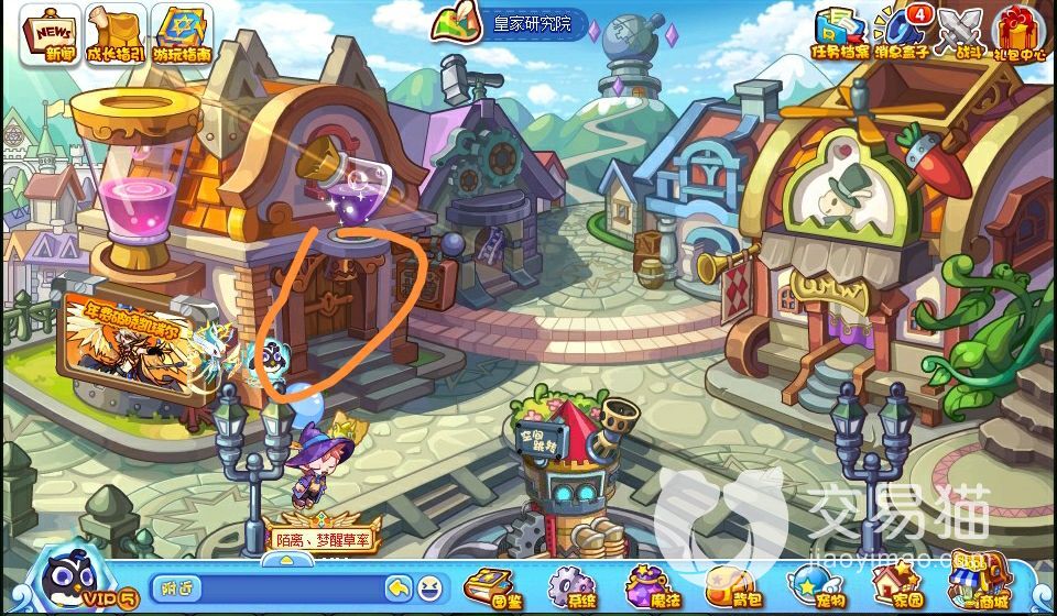要进入到破茧重生呢,首先我们得打开地图,选取皇家研究院,到了皇家研究院之后,我们可以看到地图左边有一个房子,它的招牌位置是一个药剂瓶子,点击被橙色线条圈起来的门。