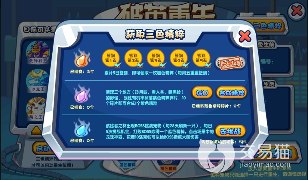 重生一个宠物需要三色精粹,每一个精粹都有自己的获取方式,就拿橙色精粹来说吧,要获得它需要每天登陆签到,蓝色精粹就不痛了,它要通过打BOSS来获得。
