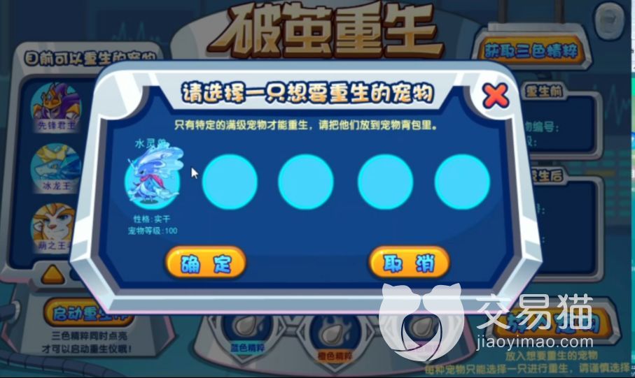 点击想要重生的宠物,我们可以选取背包中特定的满级宠物来进行重生,选择自己想要重生的宠物,将它们放入装置之中。