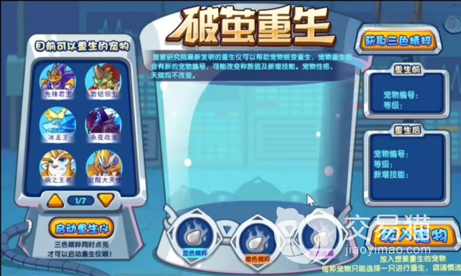 破茧重生装置可以将宠物重生,宠物重生之后会进阶,拥有新的宠物编码和技能,也会有新的形象,不过性格和天赋都不会改变。
