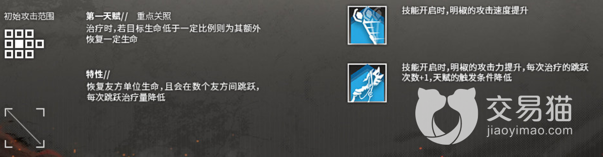 明椒的第一天赋是重点关照,她在治疗生命值比例较低的单位的时候会额外恢复他们的生命值,这样的技能适用于对治疗量需求较大的场景,因为链愈师能够一次治疗多个单位,所以这个天赋应该也能一次对多个单位触发,考虑到链愈师的攻击力可能会比较低,这个天赋还是相当不错的,很适合需要救急的场合。