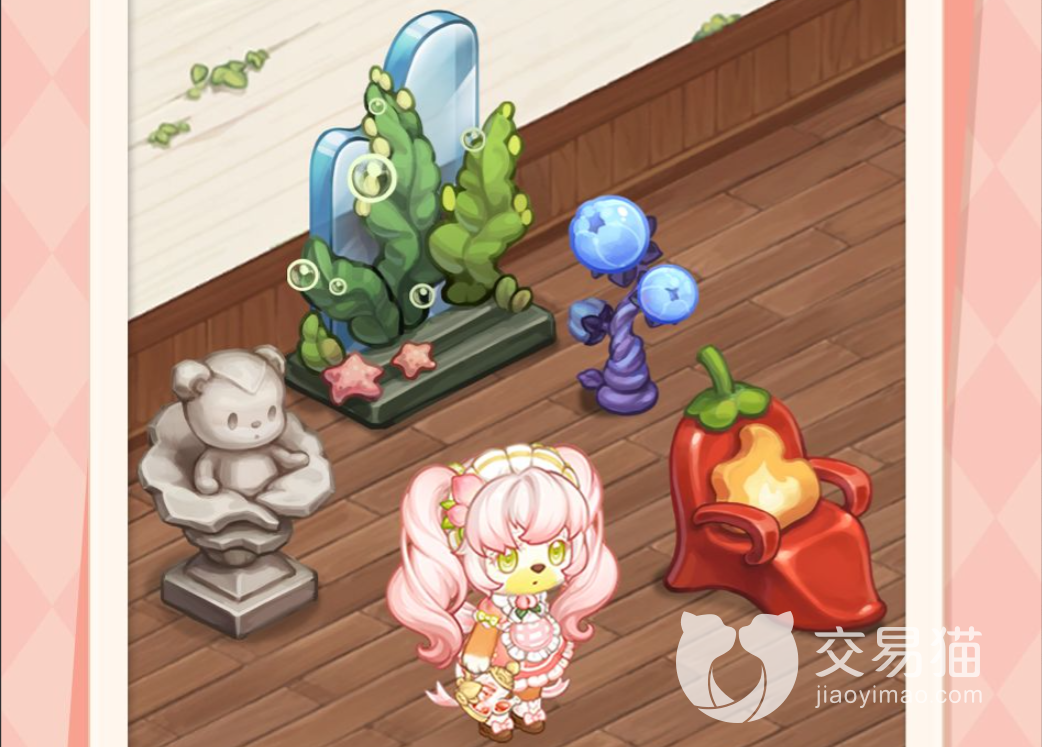 另一款服饰是以葡萄为主题的紫色装扮,头上佩戴了用葡萄装饰的帽子,眼睛的颜色看上去就是一颗晶莹剔透的葡萄,非常好看。需要抽取才能获取的除了服饰外还有家具,斗志以粉色和紫色为主的,一整套的家具可以开个小型的甜品店。