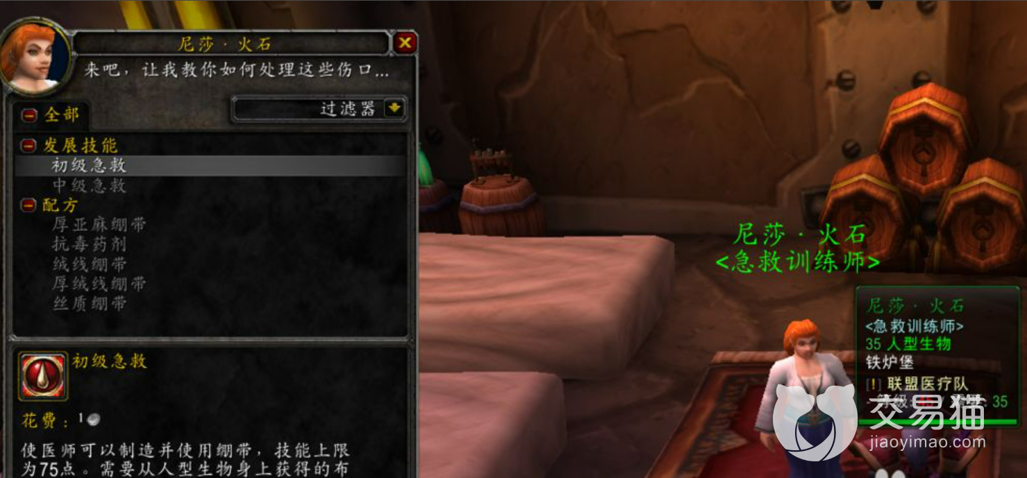 在初级急救,也就是1-75级的时候,需要用挫亚麻布绷带来进行技能训练,挫亚麻布绷带可以通过合成获得,实在没有材料的去拍卖行购买也可以,在职业等级到达50级之后,可以向尼莎·火石学习中级急救。