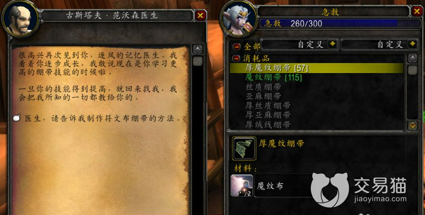高级急救150-225需要挫丝质绷带,挫厚丝质绷带,挫魔纹绷带,其中挫厚丝质绷带和挫魔纹绷带需要向NPC购买手册来解锁合成,如果没有的也可以去拍卖行购买。