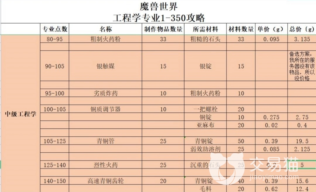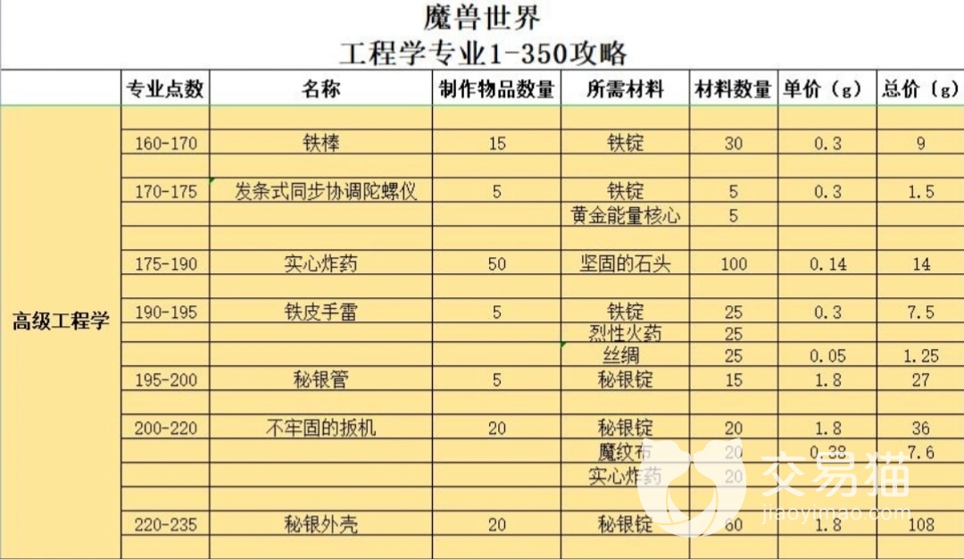 魔兽世界怀旧服工程1~300攻略 工程1~300升级所需道具一览