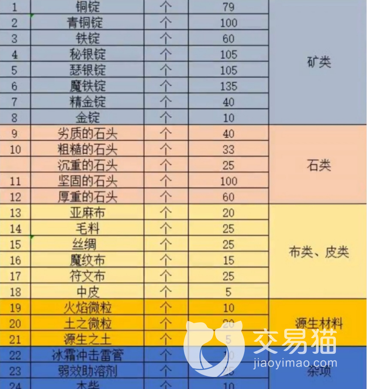 序号13~18的布类和皮类就比较特殊了,想要获得它们,只能去刷怪来获得,例如说最简单的亚麻布,要获取它,只能去银松森林,贫瘠之地等有人形怪刷新的地方刷怪才能获得,等到布的等级高了一点,符文布这一类的就需要合成了。
