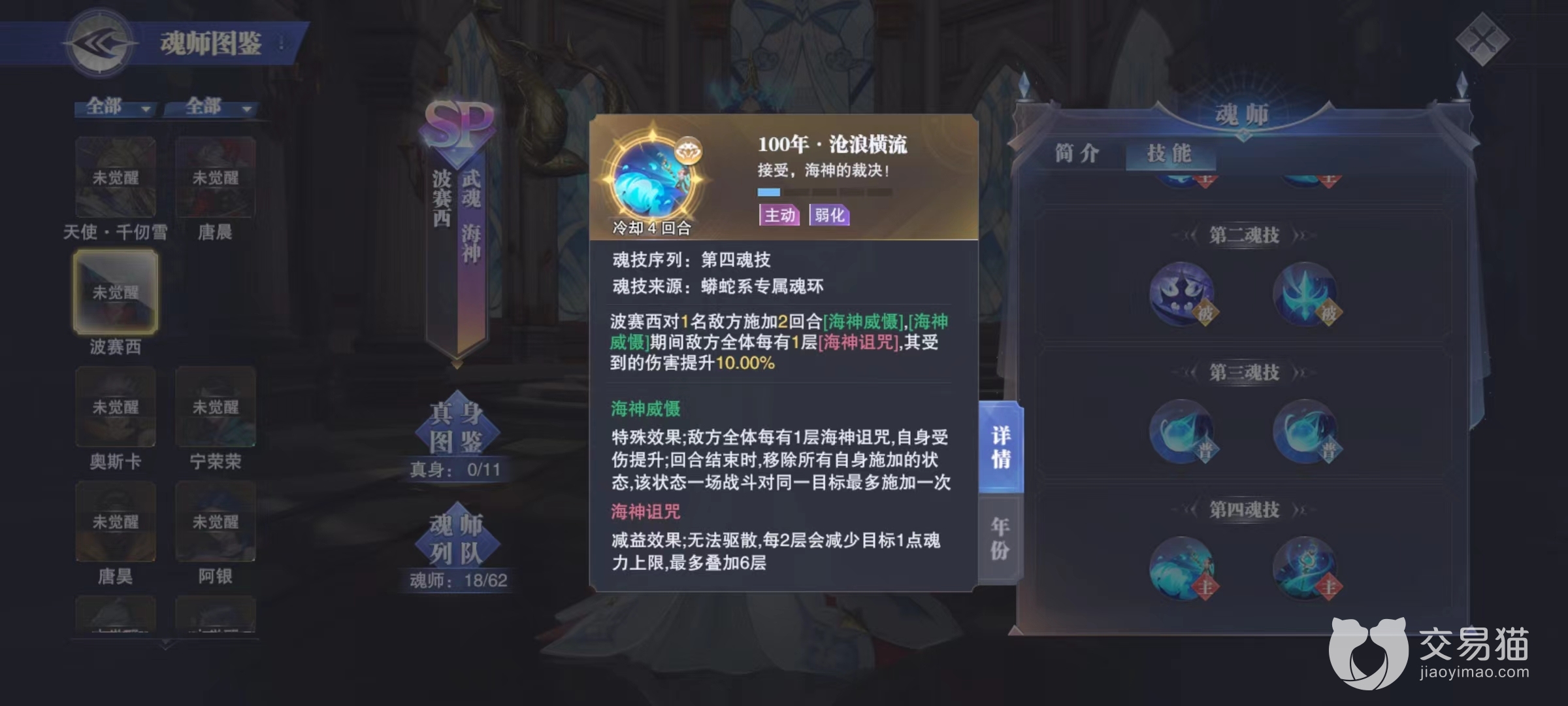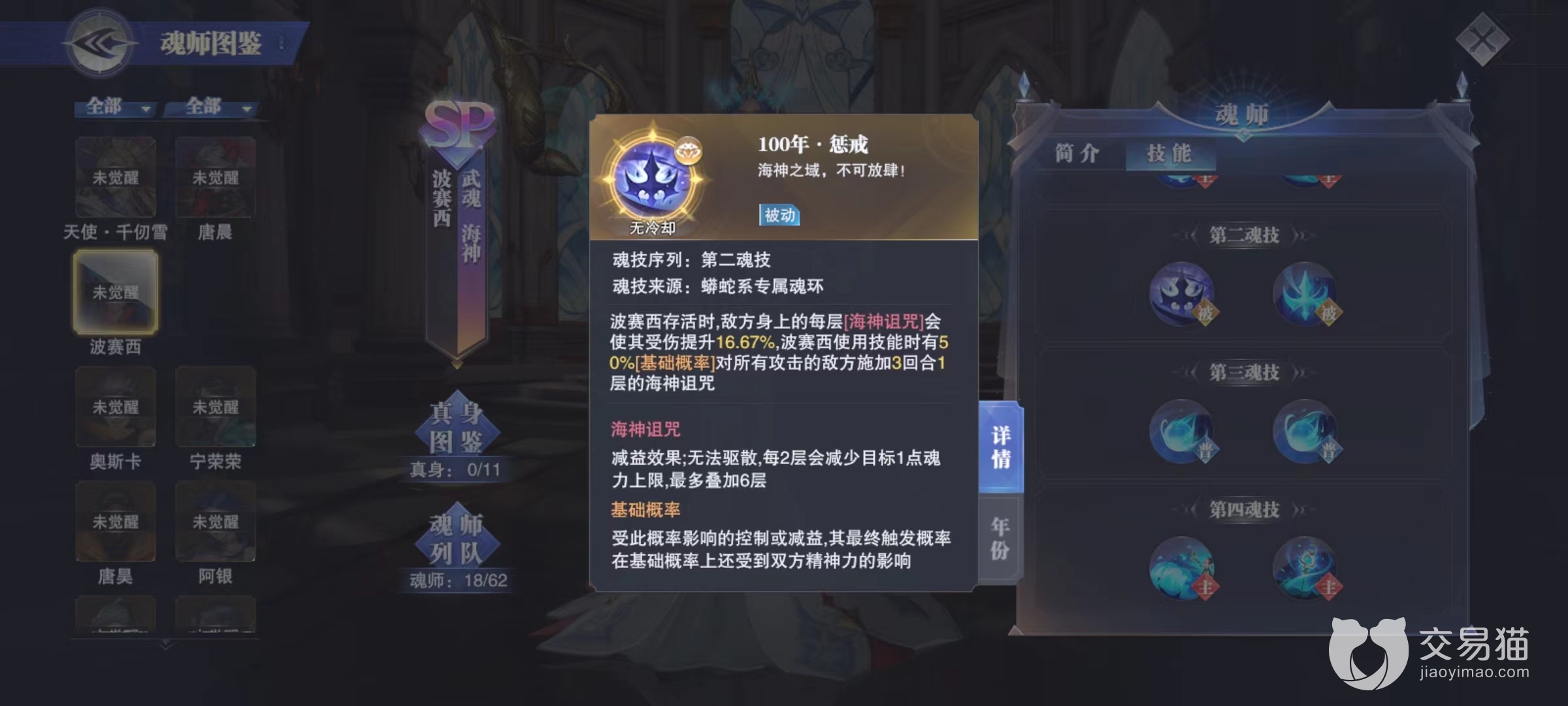 波塞西作为一名SP品质的控制系魂师,每一个魂技都有极强的效果。第一魂技可以对敌方造成全体沉默或者为己方施加海神祝福。第二魂技主要是施加海神诅咒或是为己方提高攻击力。第三魂技能够为己方的魂师提高魂力上限,这一点是很多辅助英雄所做不到的。第四魂技可以为敌方施加海神威慑,让带有海神诅咒的目标提高受到的伤害,也能为己方全体进行一次大幅度攻击力提升。