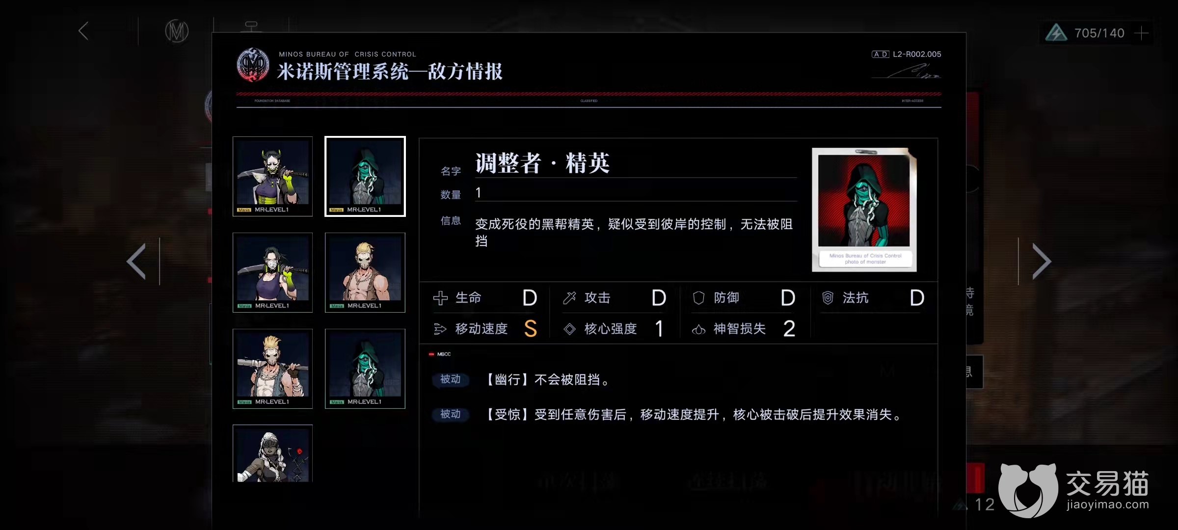 调整者·精英,他的所有面板和调整者都差不多,面板依旧很差,不过要注意的是调整者·精英的被动技能受惊在他受到攻击之后会提高自己的移动速度,他的移动速度本就很快,再加上幽行使得他不被阻挡,因此要处理起来会变得更加麻烦,破核角色可以破除他这个效果,因此攻打他的时候也是要携带破核角色的。