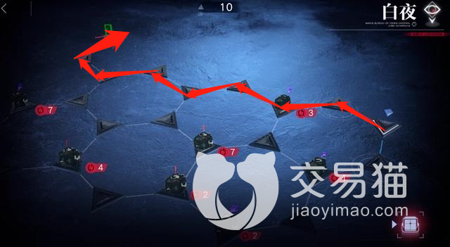 3、第三步:接着还是沿着小编标出的红箭头处出发,从起始位置一直走到右上角带有“感叹号”的地方,这个时候还有10行动值。