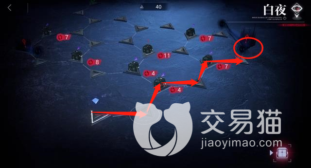 1、第一步:首先从起点位置进行出发,沿着小编标出的红箭头线条来到右上角的“红圈处”,然后将黑影给解决掉,这个时候还有35行动值。