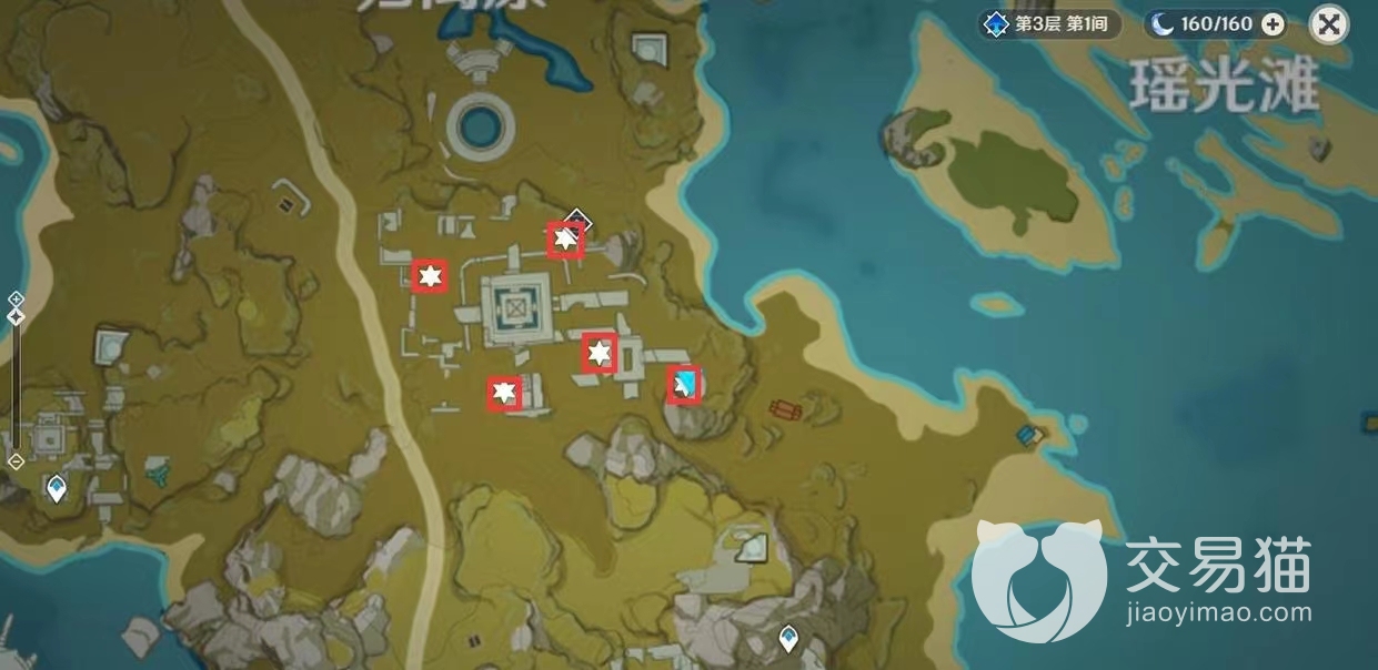 任务内容大致是让你找到散落在遗迹附近的五个古老石碑,注意边上会有丘丘人和遗迹机器人干扰你,同时还有一些普通宝箱,石碑位置大致如下: