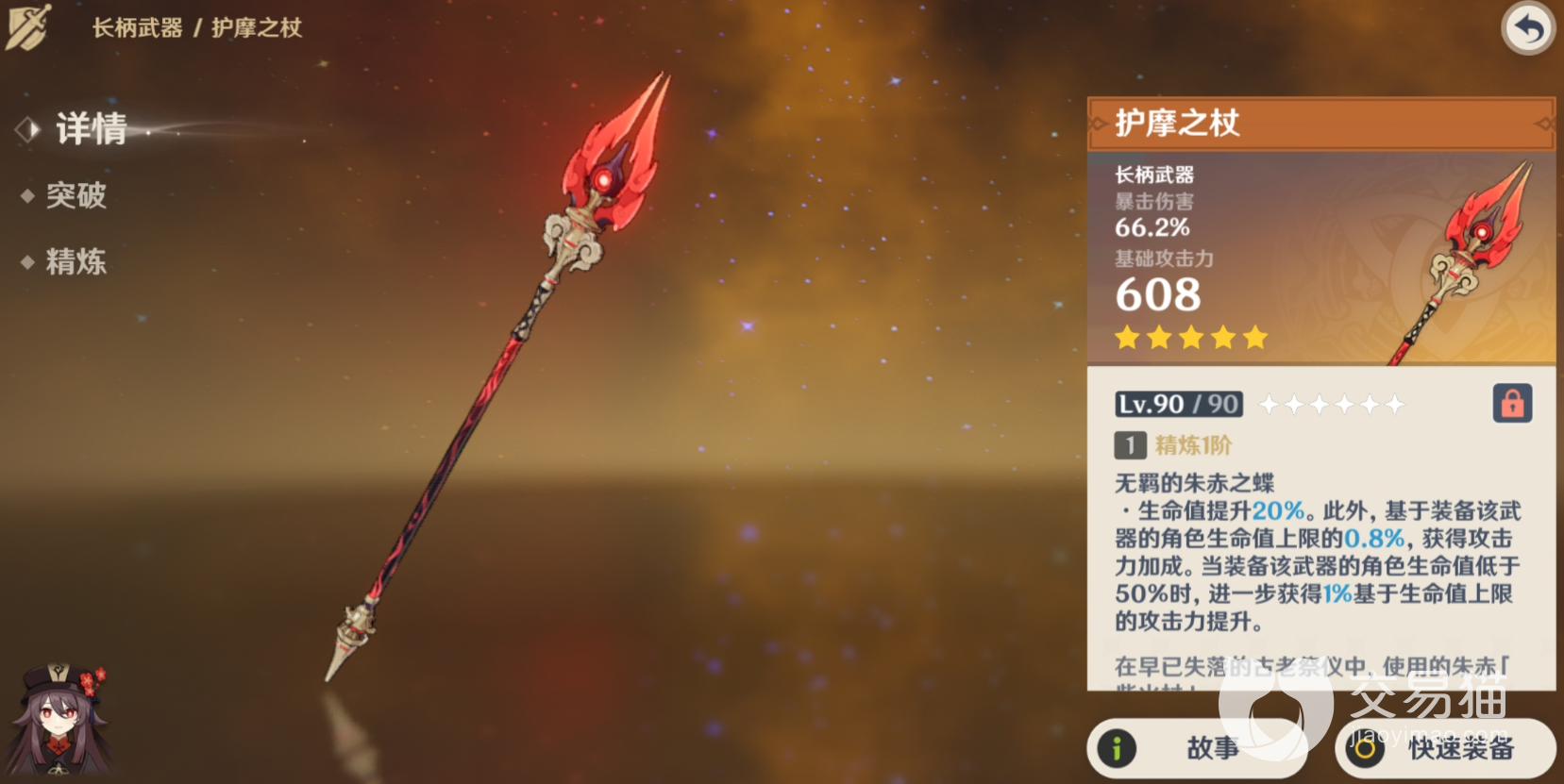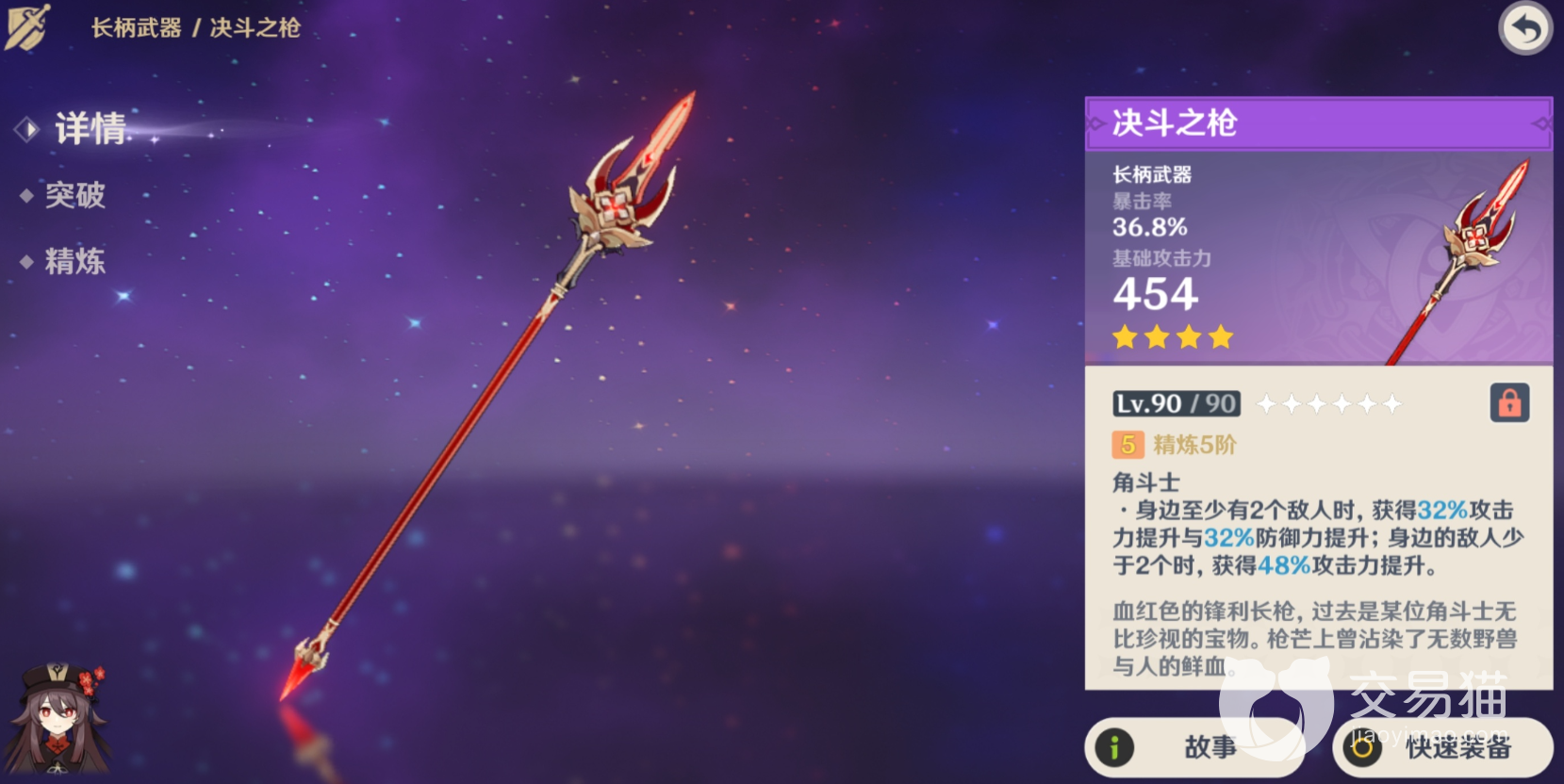 拥有毕业武器下的胡桃总体强度会得到相当大的提升,且由于本身质变的命座要求比较高在低命座时仍然想要一个较高的输出就尽量用这把武器来弥补一下。缺少专武也可以选择决斗枪,胡桃作为一个单体特化型输出决斗枪会带来与之对应的不错收益