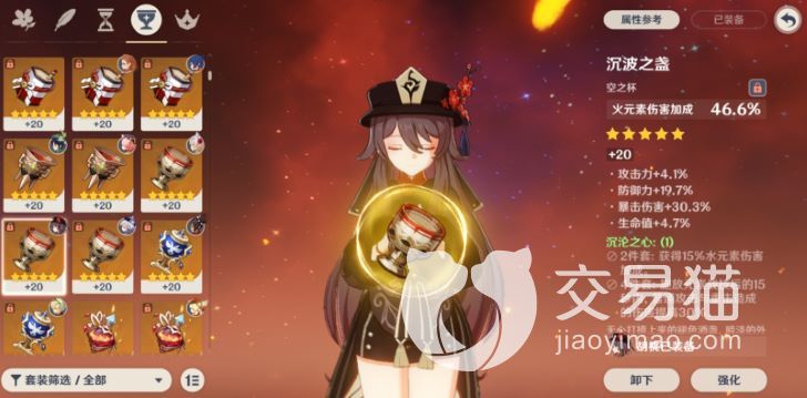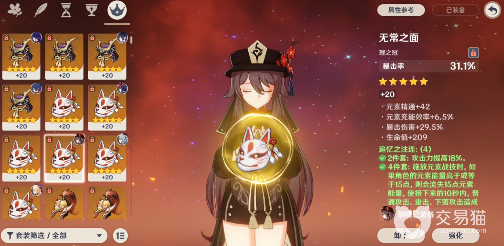 首先在圣遗物的搭配上优先选择是魔女或者追忆,但由于魔女套的怨念程度折磨了玩家多年,手头实在凑不出优质魔女套装的直接使用追忆即可。沙漏可选择精通或者生命,虽然在特定条件下精通的强度提升略大于生命,但生命值带来的容错率对胡桃这位角色也是比教重要的,副词条以暴击暴伤为主,主词条根据武器的不同会有所变化,暴击或者暴伤与武器词条反向选择即可,拥有胡桃毕业专武护摩的为最佳。