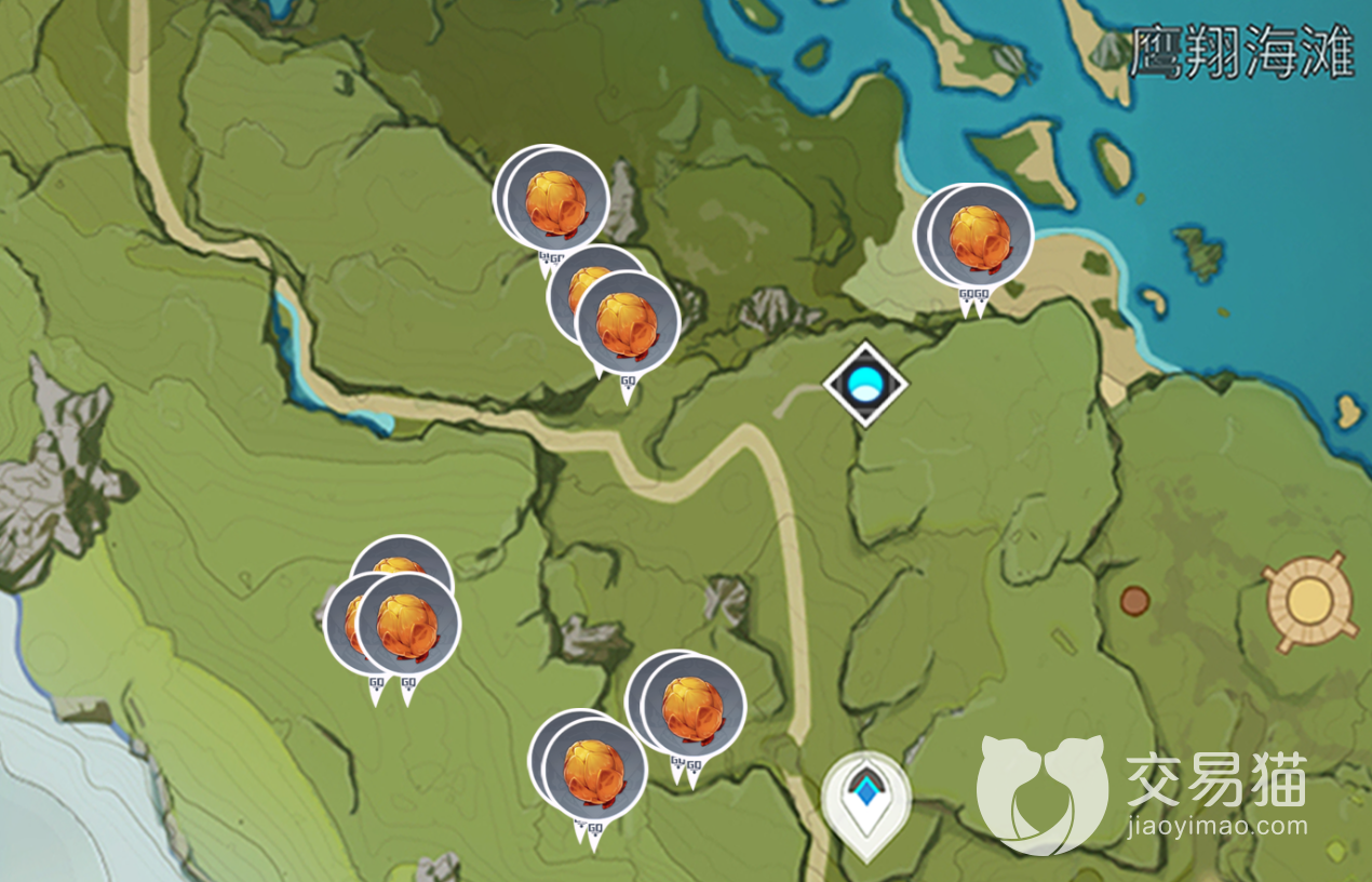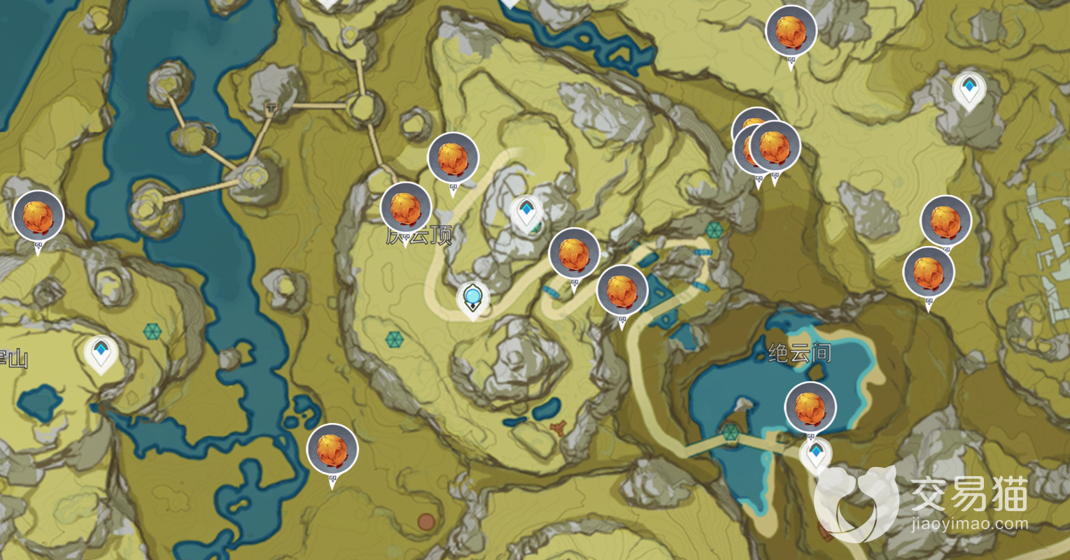 那如果需要这种材料的话应该去哪里寻找呢?这里给大家介绍一下产出量最多的几个地方供大家去收集。如图中的分布一般,从奥藏山一路经过庆云顶到绝云间这一路共计能采集到13朵;在南风狮本前周围的一片区域内也有13朵之多。