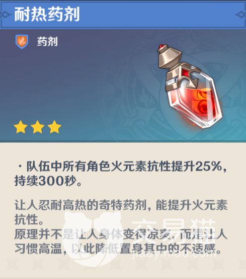 本素材搭配一个蝴蝶翅膀就可以制作出一瓶耐热药剂,可以提升全队的火元素抗性,总时长三百秒。在进本之前来一瓶,虽然限时,但并非技能效果,常驻触发也是相当不错的。