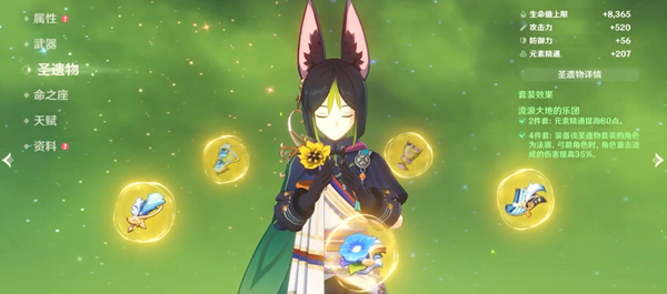 圣遗物方面推荐饰金四件套或者是乐团四件套。首选饰金,因为乐团对于大招是没有什么直接的伤害加成的。有的小伙伴可能要问,为什么不带草套,草套的主要作用是削减敌人的草系抗性,这种功能性比较强的建议让辅助位来带。饰金的效果比较imba,比如给提纳里配三个火系队友,那么提纳里就能够吃到三层的精通效果,还是相当不错的。