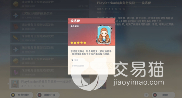 埃洛伊获取方法:其实只需要参加原神与PS的联动任务就可以了,具体的方法就是在活动时间内使用PS4或者是PS5的原神客户端登录账号,就能够直接获得官方发送的奖励邮件,领取之后就能够直接获得这个角色了。非常遗憾的是,活动时间早就过去了,目前也没有任何办法能够再次获得埃洛伊,只能期待官方下一次能够推出类似的联动活动或者是开放埃洛伊的其他获取方式。
