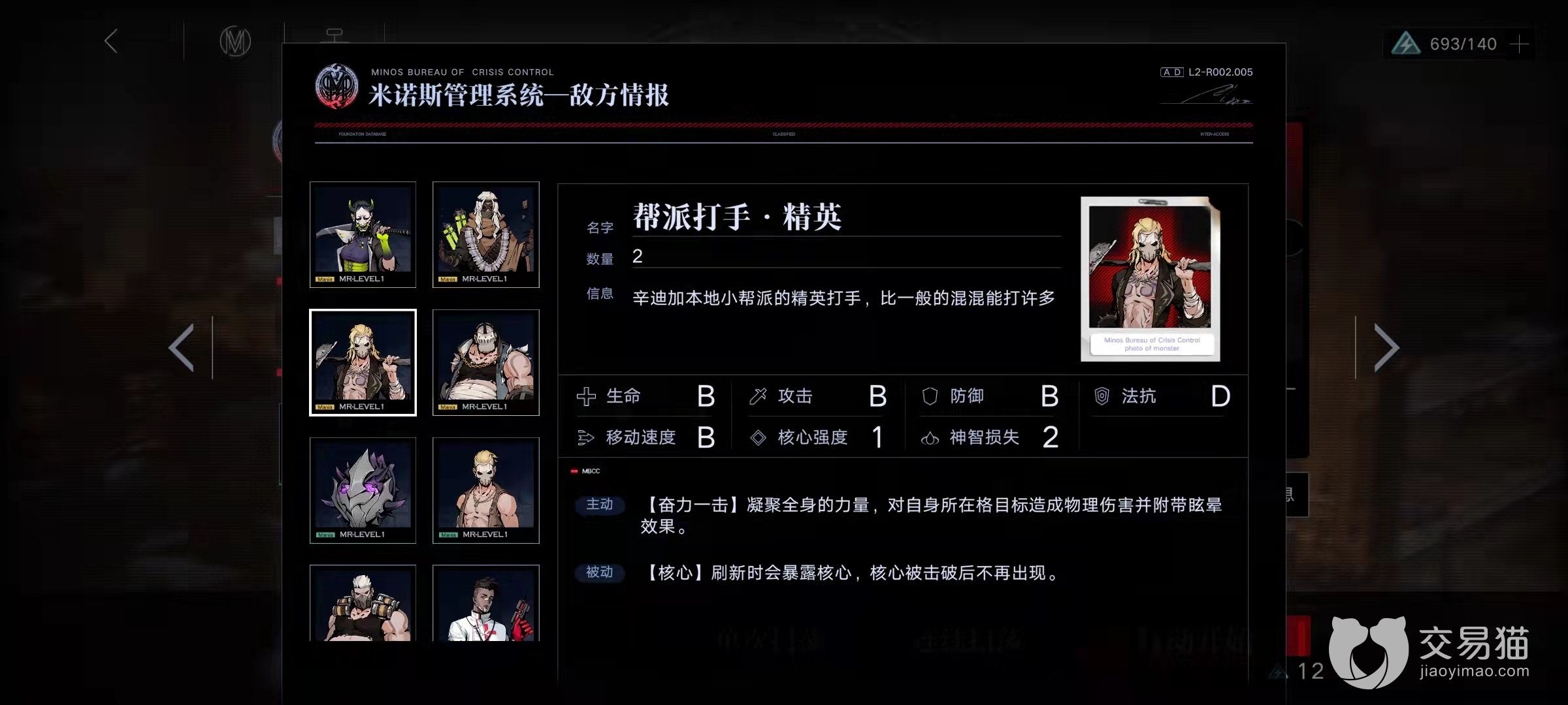 帮派打手·精英,是一个数值较为平衡,没有什么明显劣势,属于中等难度的敌人,这个敌人拥有一个核心强度,他有两个技能,一个技能是奋力一击,可以对自身所在格子的我方禁闭者造成附带眩晕的范围伤害,这个技能可以用破核技能打断,被动效果是核心,帮派打手刷新的时候自身的核心会暴露出来,因此要携带有破核能力的禁闭者,帮派打手·精英的核心被破坏后被动技能核心就不再触发了。