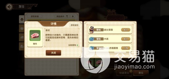 然后就是食材的获取了菜可以在菜园里获取,只要玩家常驻角色打理种下相应的蔬菜就可以了,但是肉类就需要冒险里随机掉落了,游戏里还有比较方便的功能就是消耗一个面包就可以自动刷取想要的食材了可以说非常人性化。