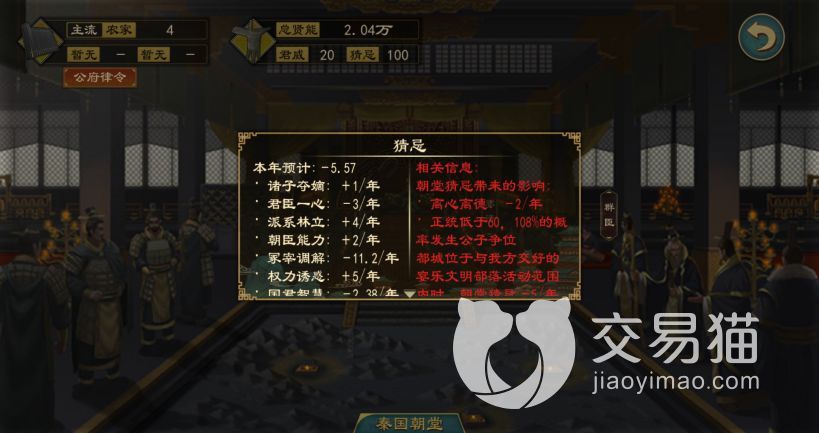 当这个数值过高的时候会影响到国家的稳定和帝王的威严,想要降低它就可以尝试通过设宴邀请众臣,完成对应的成就,是能够将其全部清零的。时刻关注朝中的派别分类,将其严格控制在三种之内。
