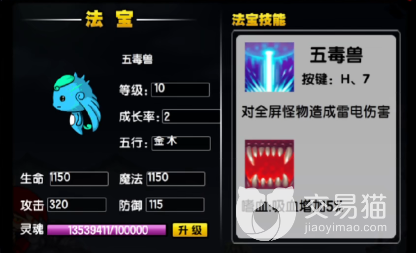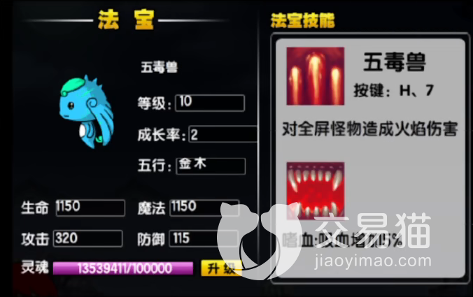 接下来介绍一下五毒兽这个宝宝的属性以及技能特点。首先成长率是概率出的,最高是2.0,这个对于最终培养出来的数值至关重要;两个技能均不固定,主动技能有火和雷两种,火属性攻击为物理伤害,可以触发吸血被动,雷电攻击判定为魔法伤害,虽然不能吸血但伤害为多段且数值比火要高一些,两者都很好用但根据玩家的需求不同可以有多种技能搭配方法。