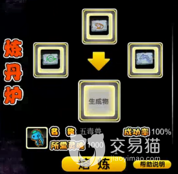 合成方式比较简单易懂,就是使用五毒印记在炼丹炉中熔炼,成功率是百分百必定获得的,不用担心会碎材料白忙活一场。操作方式就是蝎之印记,蛛之印记,蚣之印记熔炼合成毒虫印记,加上蟾之印记,蛇之印记合成五毒兽。