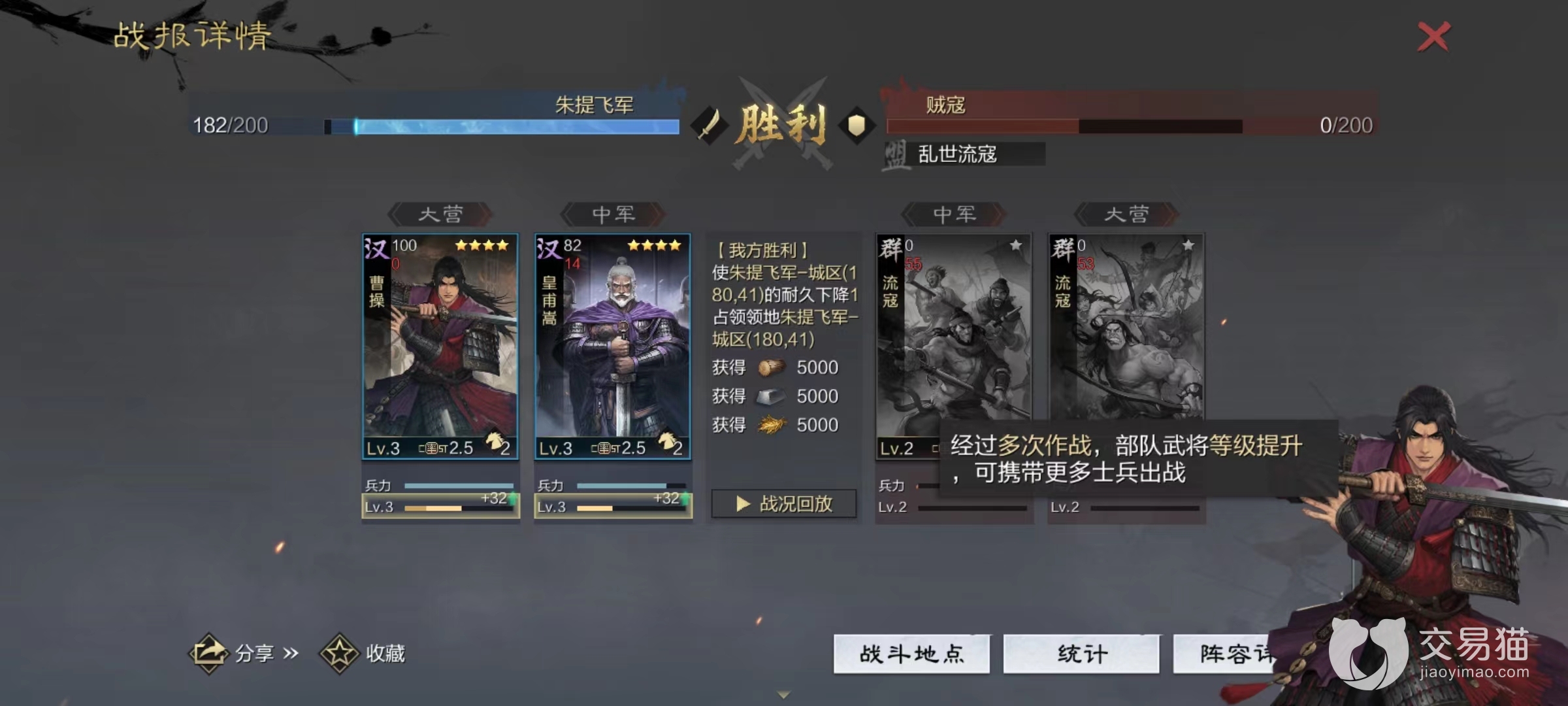 最后再介绍一下开放的小细节一定要注意,当武将阵亡后,即使队伍中有伤兵那么回城也依然不会恢复,所以极力避免。在适当时候可以保存一些体力扫荡低级土地,这样能够快速提高武将等级,高等级武将能够显著降低开荒时损耗。