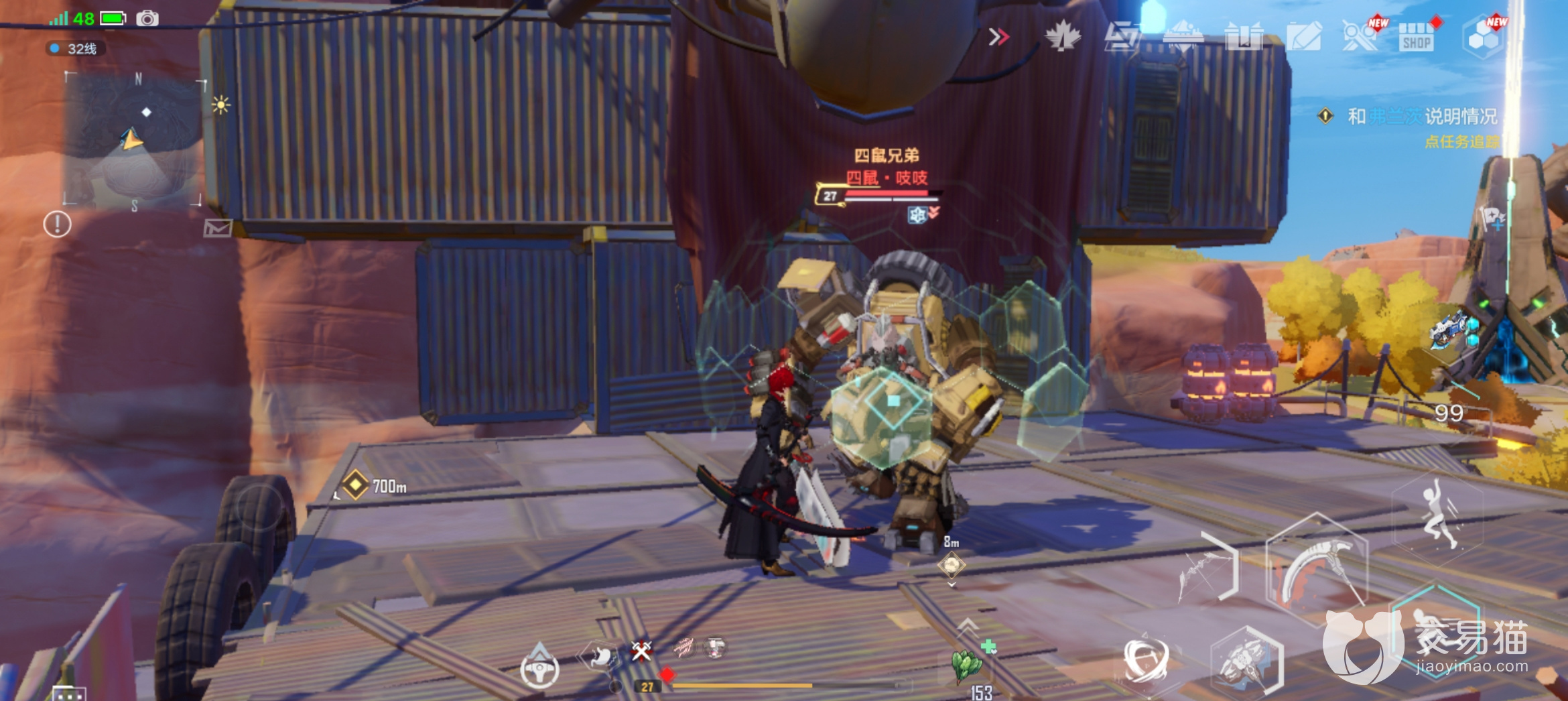 四鼠在星岛地图上,玩家需传送到Mega擂台折跃门,转身往南看,可以看到一个营地,吱吱就在这里。到营地之后,吱吱在房顶上,可以用喷气背包直接飞上去。