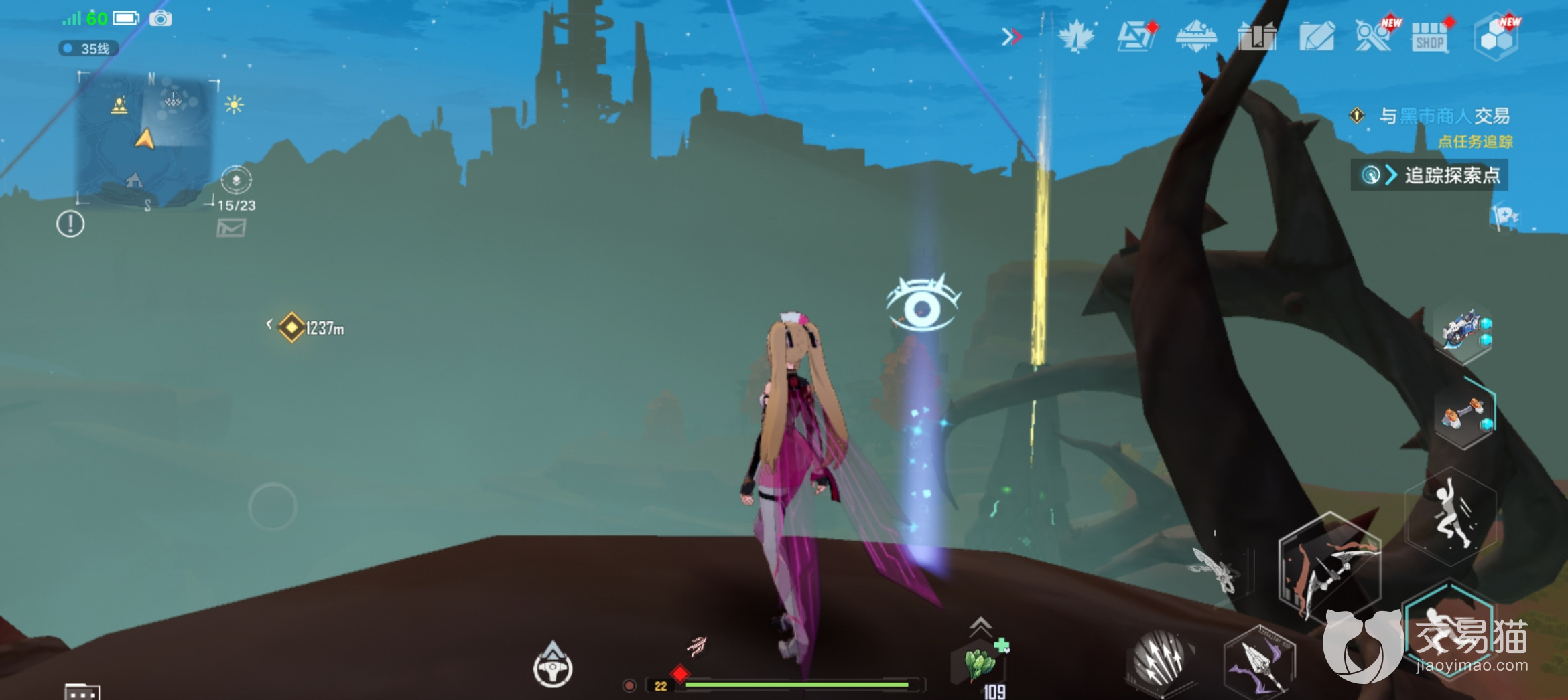 我们先传送到避难所,来到顶部有绿色十字标识的房子,这个房子比较好找。把角色背对房子,向着左手边山崖走,注意在崖边找眼睛标识即可。