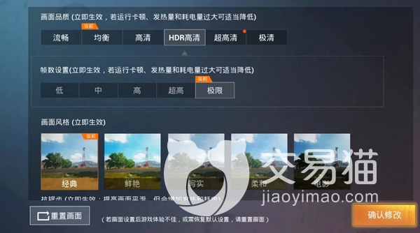 游戏内有5种画面品质设置,分别是Uhd超高清、hdr HD高清、高清、均衡与流畅,分辨率从高到低递减,官方默认是均衡,部分低配置的手机打开游戏可能会默认成为流畅画质。画面品质会影响玩家的游戏流畅程度、手机的发热量与耗电量,所以务必调整最适合自己手机配置的画质。