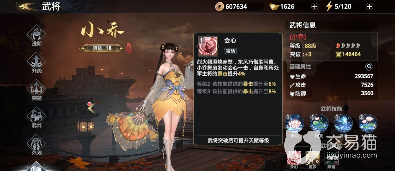 接下来是首充就能够拿到的小乔了,它的能力十分不错,不仅是队伍里面的常驻奶,也是辅助一号选择,因为能够提升暴击率,同时恢复生命值的效果真的是实用啊,在见红的情况下,把武将血条拉回来,这是能够让敌方感受到绝望的事情。