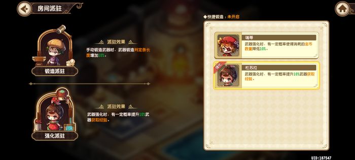 “强化派驻”就是在玩家强化装备的时候出现了作用了,可以选择的角色也是两个,分别是瑞蒂和杜苏拉,分别是一定的概率减少百分之十的金币消耗和提升百分之十的武器经验获取,总之是一些不错的节省资源的buff。