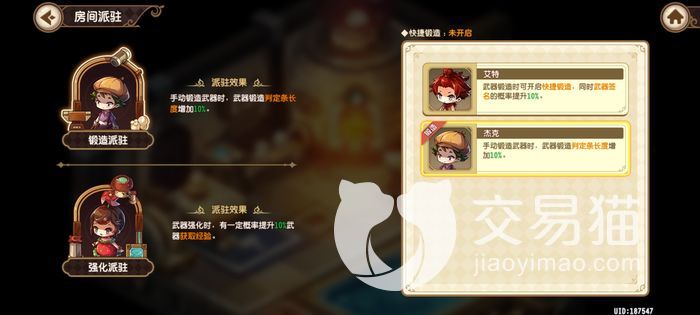 “锻造派驻”的角色一般玩家可选择的是艾特和杰克都是坦克角色,艾特可以让玩家快速铸造装备,还能提升签名概率,杰克是让手动铸造的判定条增长,一般的判定条很短玩家很容易错过有了杰克就能三次都完美的概率大大上升了。