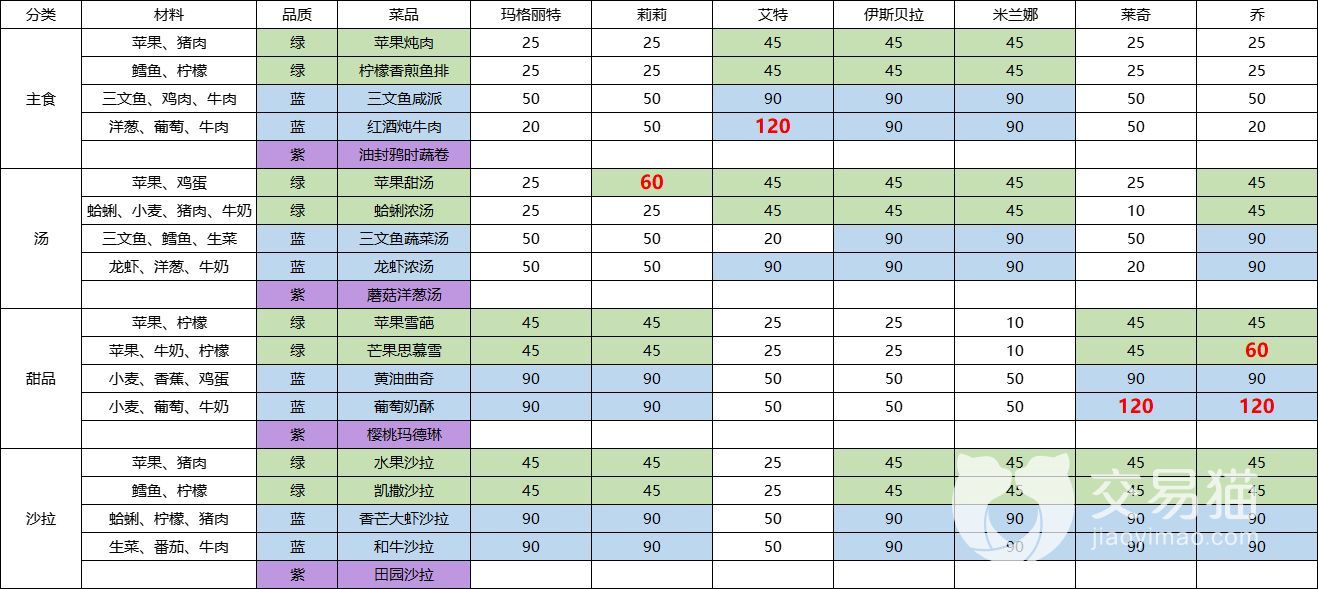 首先玩家需要进入“兔窝厨房”,主界面点击“营地”的选项就能找到了,进入这里面就可以开始你的烹饪之旅了,食物分为四种:主食、甜点、汤以及沙拉类,每个用到的食材是不同的,具体的配方如下: