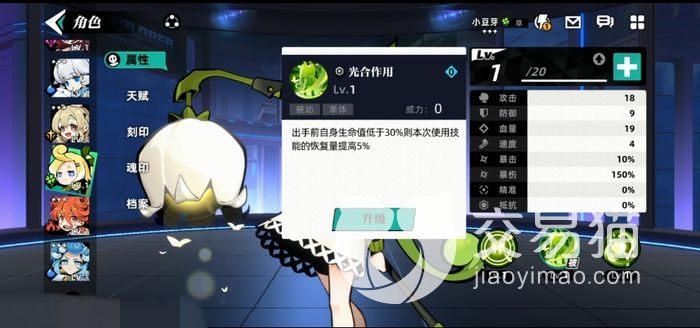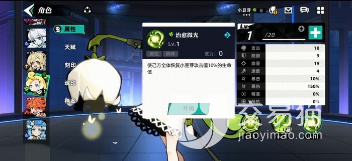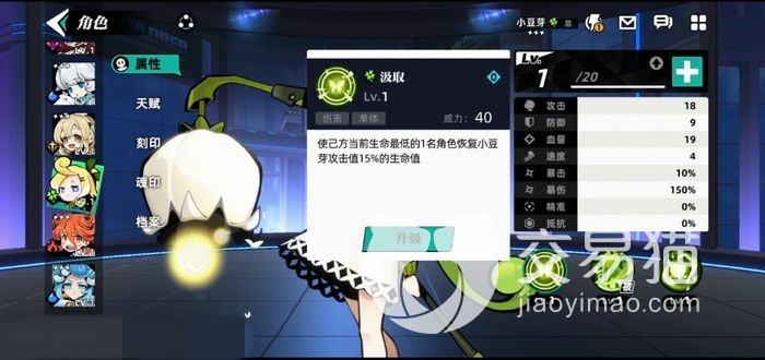 首先是普通技能是使用自己方生命值最低的一个队友获得小豆芽生命百分之十五的恢复当然这还只是一级的效果,数值是会随着技能提升不断变高的,所以小豆芽的属性还是需要增加血量才能保障奶量充足。