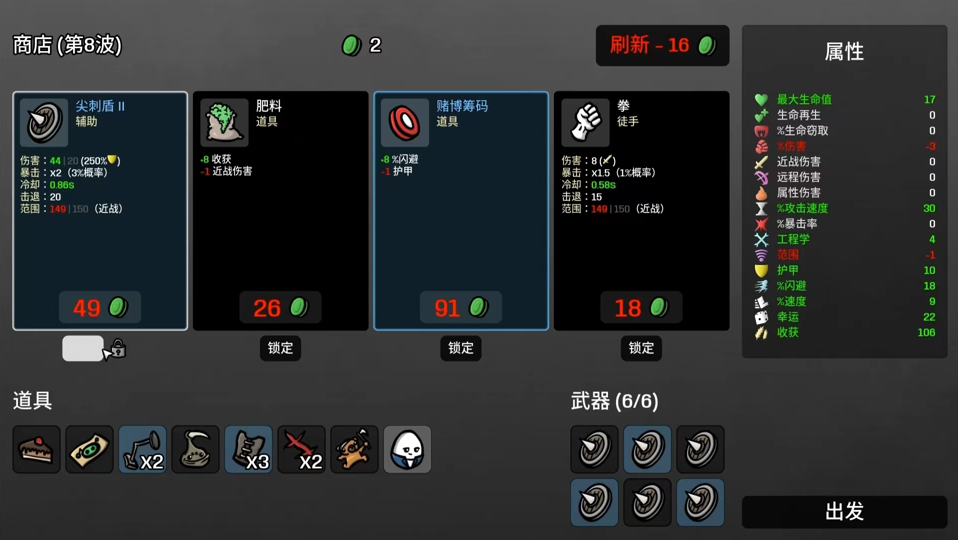 1、核心装备为尖刺盾,最佳的效果是带上6个高品质的尖刺盾,没有其他的要求基本上是有手就行。小编在第一次解锁了尖刺盾后,发现这个武器和受虐狂的被动契合度非常的高。