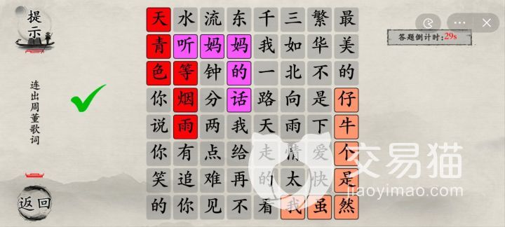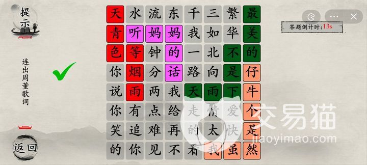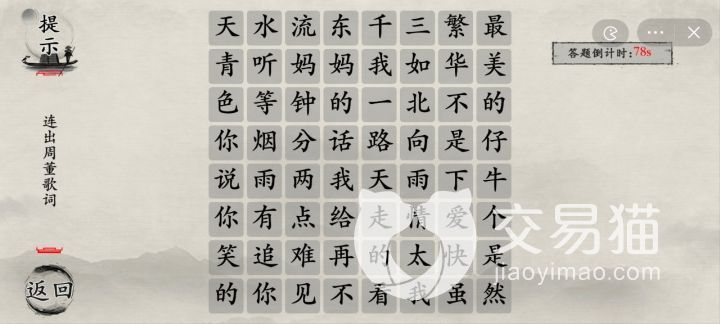让大家把这些文字连线成周董的歌曲,来看是不是周董的真粉丝,这关总体来说不是很难,他问的都是一些家喻户晓的歌曲,只要大家把这些字连起来就通过这给关卡啦。