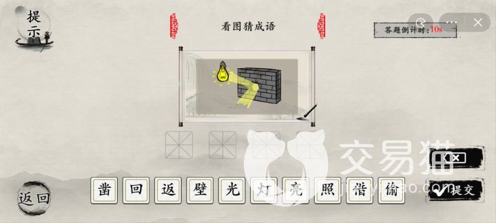 第二关是一个看图猜成语的游戏,是一个公务员必考图,在这关中给大家一张图,这个图里面画着一堵墙个一个灯泡,灯泡的在墙上反射回来了,下面还给了十个字,需要通过这些次以及上面的图片组成一个四字成语。这关的答案估计很多玩家都猜不出来,其实非常简单,光反射回来了就是回光返照呀。