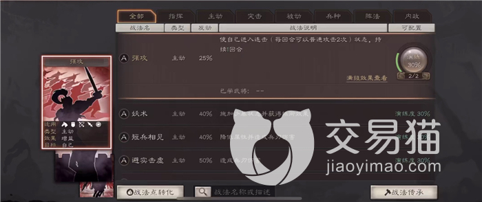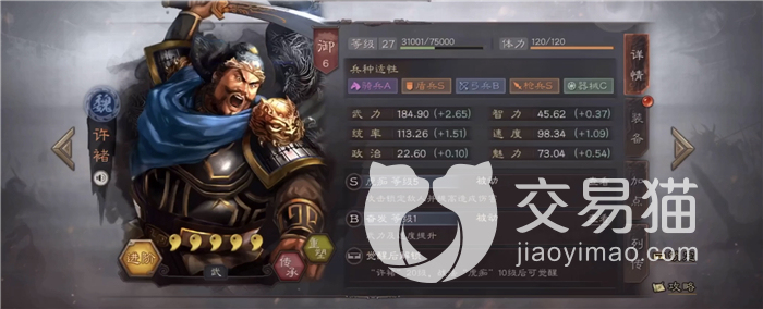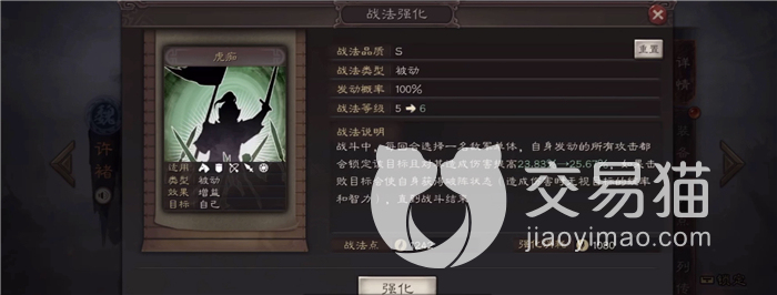 而他的战法叫虎痴,简单来说就是自带锁头和增伤效果,若能击杀对面武将,全局战斗会进入兴奋状态,获得破阵效果,所以他的战法搭配主要是以单体高爆发的多段伤害为主,这样就能充分利用自带的增伤效果来打伤害,推荐是轻勇飞燕+暴敛四方。