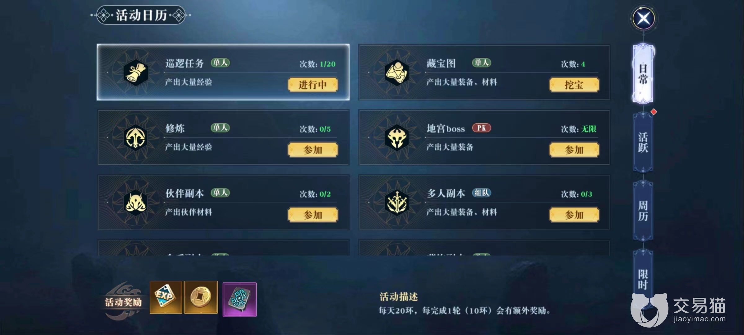 第1个活动是日常巡逻能够给予大量经验,每10个为一轮,每天只能做两轮,在昊天城中找到叶云飞帝接任务,然后只需要挂机等待自动寻路就能完成,非常方便。此任务单人就能完成,在之后每天上线后第1件事就是先将巡逻做完。第2个活动是修炼,同样是单人活动,只需要短时间的挂机就可以获得大量经验。