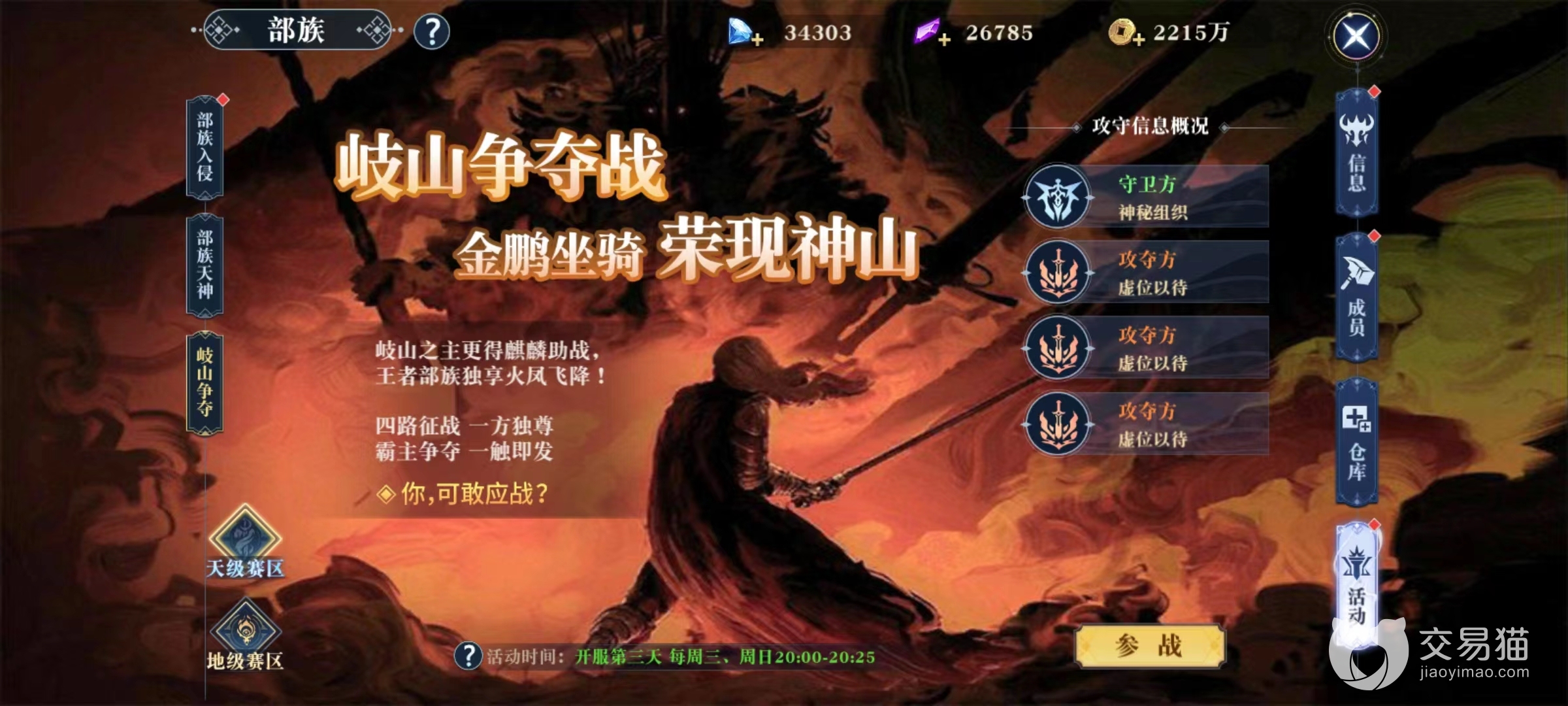 岐山争夺战按照赛区分为天级和地级,参战的部族分为守卫方和抢夺方,这是需要全族参与其中才能更好进行的活动。攻击方需要在规定时间内击败boss,而防守方则要阻止攻击方达成目的。一定要积极参加这三项活动,不然贡献过低很难在这里混下去。