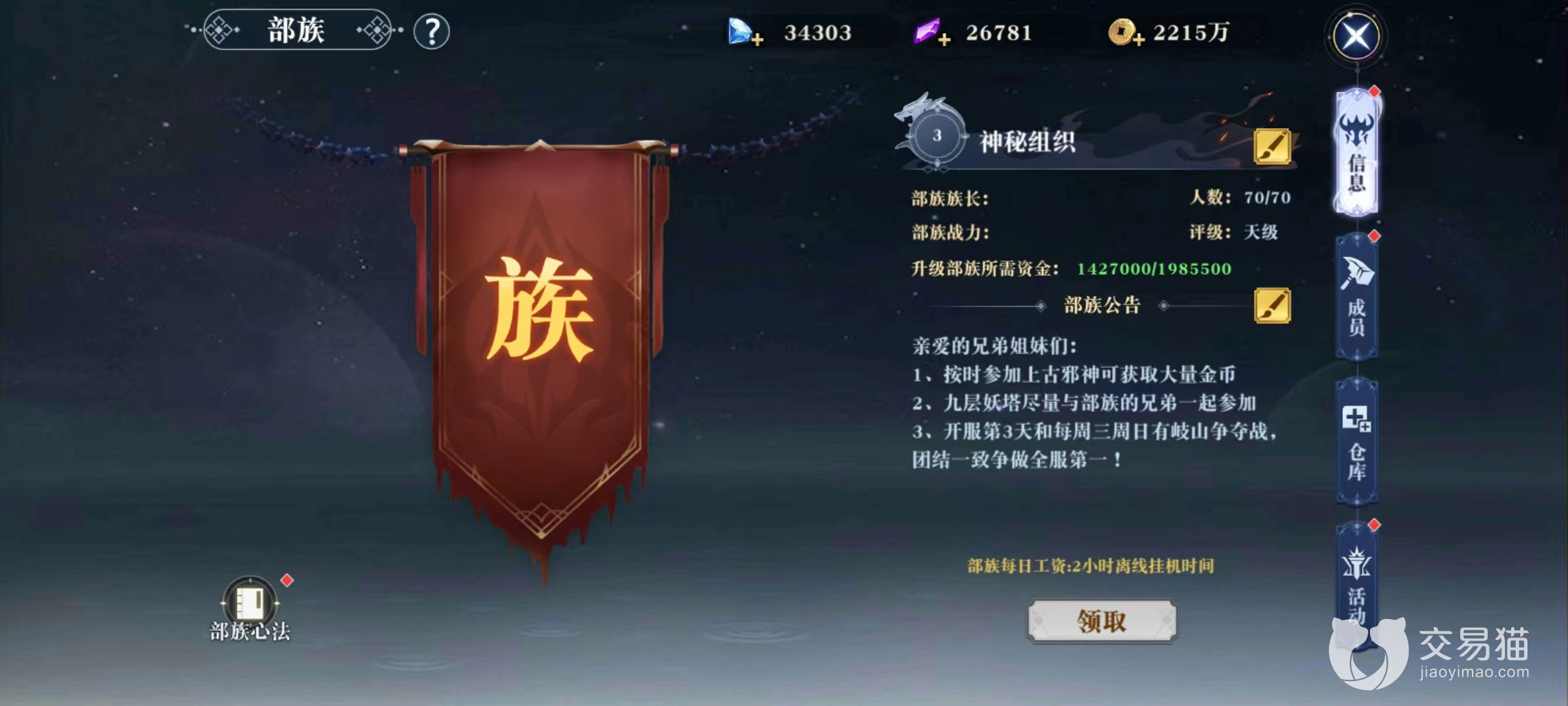 进入之后的第1个福利就是领取工资在主界面就可以领取到,工资主要是离线挂机时间,这一点很重要,能够在普通挂机时获得更高奖励。第2项就是部族心法,通过各种活动获取帮派贡献,就能在这里进行技能提升,主要效果包括增加攻击、生命值、防御、破甲、闪避、命中、暴击和坚韧,这些效果每提升一级都要消耗大量贡献。在提升时,小编建议采用均匀升级的方式,这样能以最小的代价获得最好的效果。