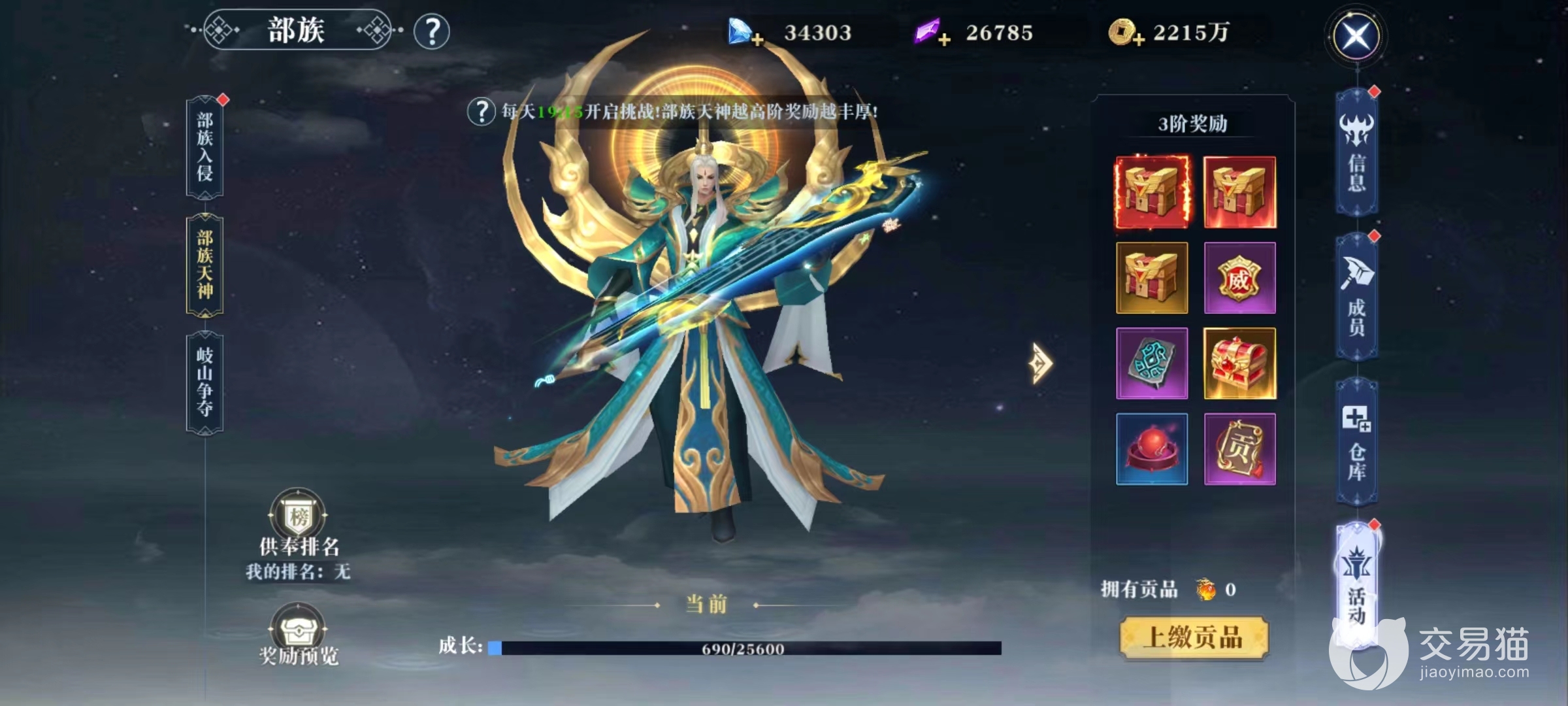 第5项是部族活动,进行集体活动是存在的主要意义,目前开放的有部族入侵,部族天神和岐山争夺这三个大型活动。第1个不足入侵主要是部落之间的战争,通过入侵敌方领地能够获得大量奖励,还有击杀boss和精英等玩法。部族天神是当前所有族中成员都可以上交贡品,根据数量来获得不等的奖励,主要有神装宝箱、威望值和伙伴宝箱等奖励。