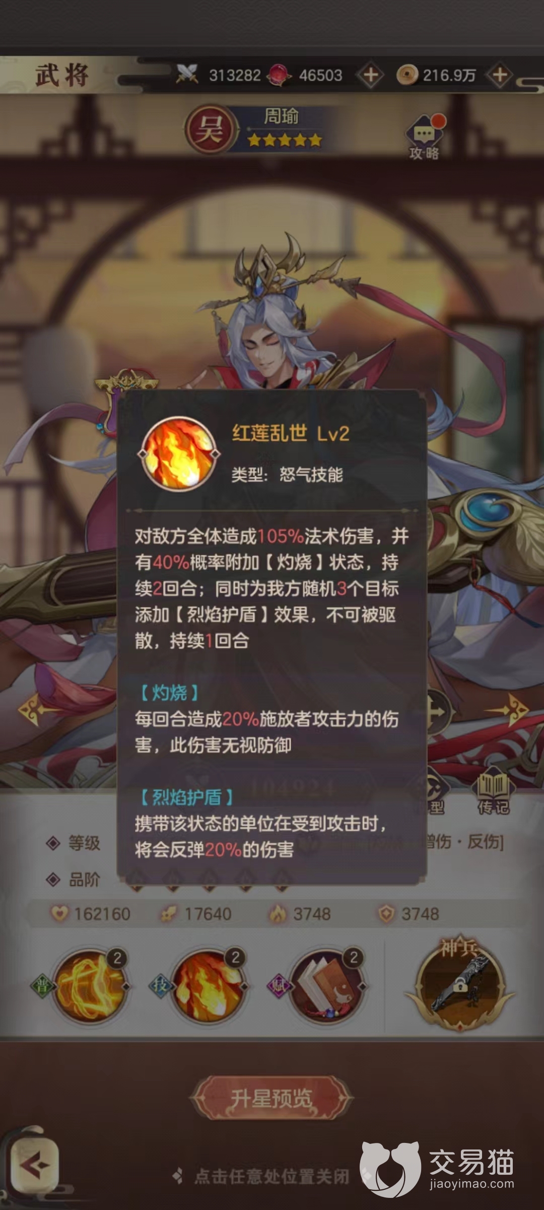 周瑜同样是范围输出的典范,普攻能伤害敌方前排同时攻击后,使得伤害目标有几率在接下来受到伤害提升。技能是一个全体伤害效果,同时有几率附加灼烧状态,还能附加一个为己方随机三名武将施加护盾的状态。因为在开荒阵容中不会选择肉盾,所以周瑜的这一护盾能够起到提高生存的效果。