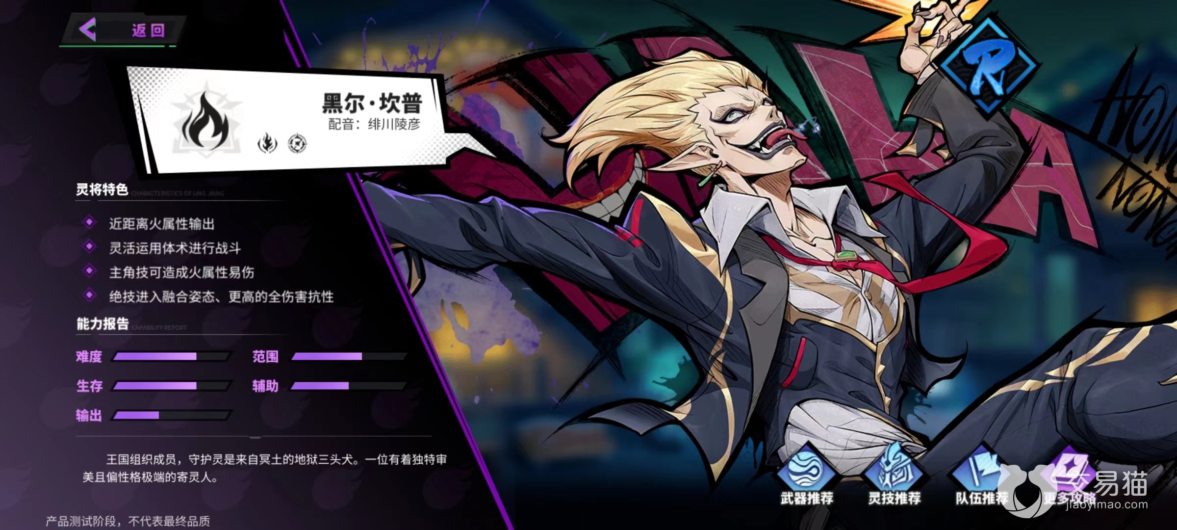 从能力报告来看,操作难度比较高因为技能全面,输出虽然低一些,但是生存能力高。武器方面无论是选择紫色的夜影马刺,还是橙色的吞骨火,都能起到不错的作用,如果资源充足也能配置上专属武器撩血之牙,装备之后可以使黑尔坎普进入到狂暴状态,获得移动速度和攻击速度的加成,如果资源不足也可以不去配置。