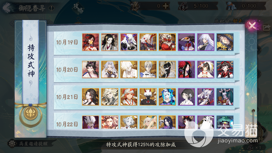 活动期间每天都会有不同的特攻式神,这些式神在当天的鬼王战斗中获得125%的攻防属性加成。对于新手来说是真正的福音,可以通过使用好友列表中每天挂出的助战凭借着特攻加持打出非常不错的伤害,无需像以前一样用着自己手中不成形的队伍在整个活动期间肝出可怜的资源数量。一定算得上是是本活动中可圈可点的好机制。