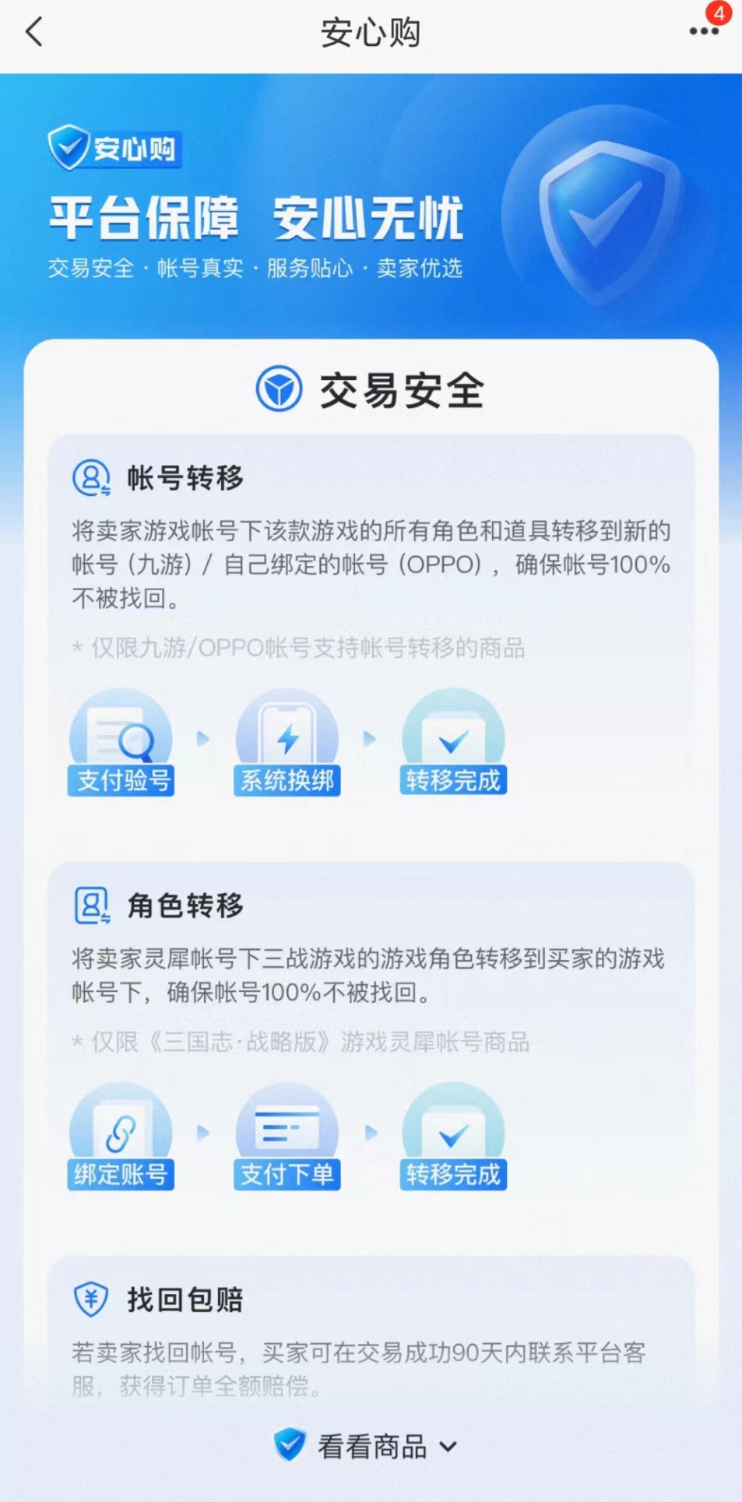 对于一个账号交易平台而言,最为重要的参考因素便是购号安全度的问题。这里有极为出色的找回包赔服务,当你购买的账号被无良商家收回时,系统将会给予你一定的补偿。同时还有极速换绑,让你在拿到号的一瞬间便可以迅速将账号的各个信息都改为自己的。更有商家认证系统,让你能够远离黑心卖号人。