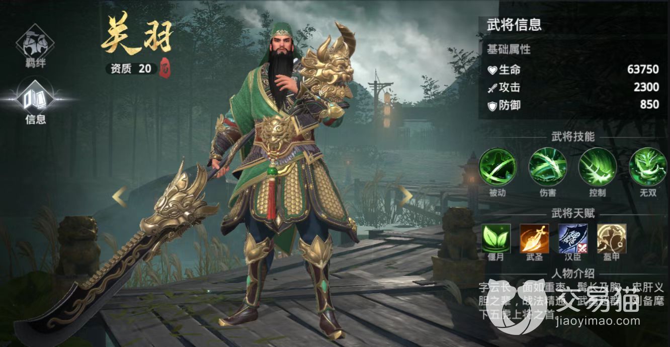 首先大略介绍一下关羽的情况,资质为20点属性成长上非常全面,技能方面既有控制又有伤害,同时自身防御力成长也很出色,是大家最喜欢的能扛能打角色。但是获取关羽需要专题活动,并且消耗数量众多的元宝,或者是通过武圣列传、武圣之路等专属活动去兑换,需要长期的培养过程。